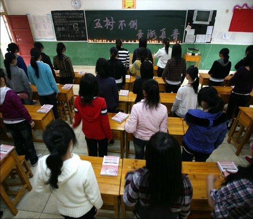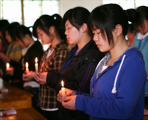 在教师的带领下,同学们点燃手中烛光,肃立在课桌旁,用默哀一分钟的方式送上了对遇难同胞的深深哀悼;同学们打着手语齐声歌唱的一首《感恩的心》,则捎去了大家对青海人民重建家园的美好祈福。